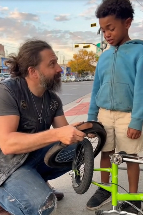 While fixing the tire, the biker noticed the boy’s worn-out sneakers and faded hoodie. “What’s your name, champ?” he asked.