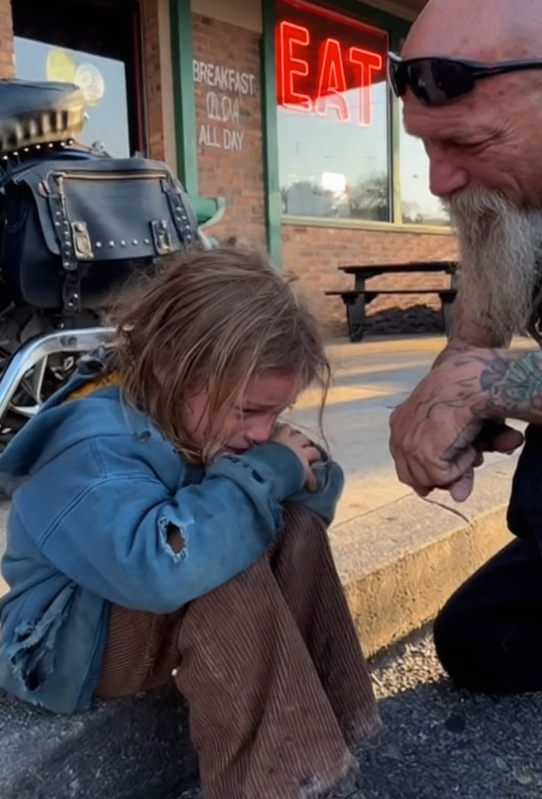 He crouched down, his leather vest creaking, and asked gently, “You alright, little miss?”