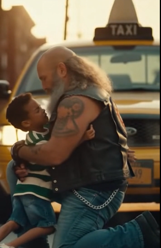 The cab screeched to a stop, the driver’s coffee splattering across his windshield. Matt froze mere feet from the Harley, his tiny chest rising and falling with panic. His soccer ball rolled gently until it tapped Jake’s boot, almost like it understood what had just happened.