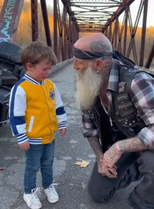 The biker lowered himself to one knee so he could look the boy in the eyes. His own voice cracked as he spoke—soft but full of conviction.