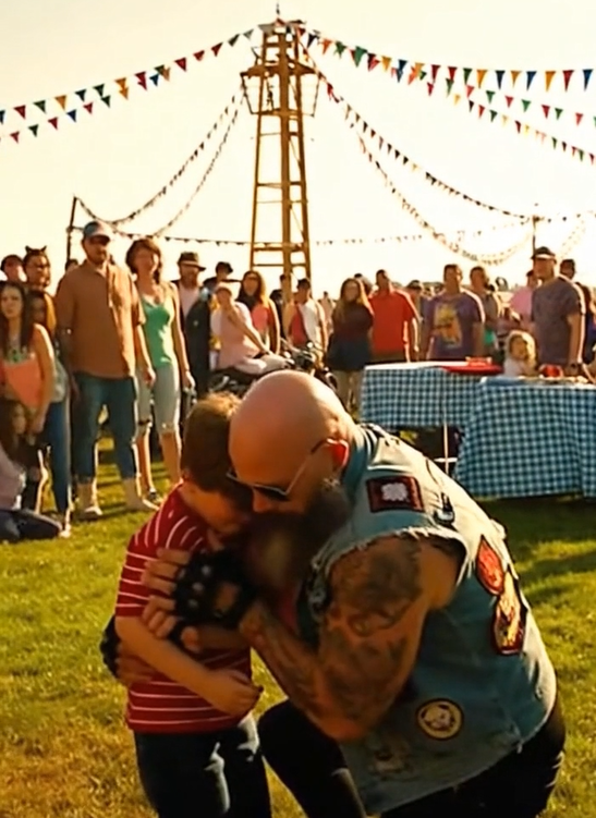 A few steps away, Hunter “Roadstone” Briggs leaned casually against a food stand. With broad shoulders, a leather vest, and road-dust on his jeans, he looked more like he belonged tearing down an open highway than browsing festival snacks. But Hunter appreciated a quiet town moment, especially after thousands of miles behind him. Most people saw only the beard and tattoos. Few ever saw the heart underneath.