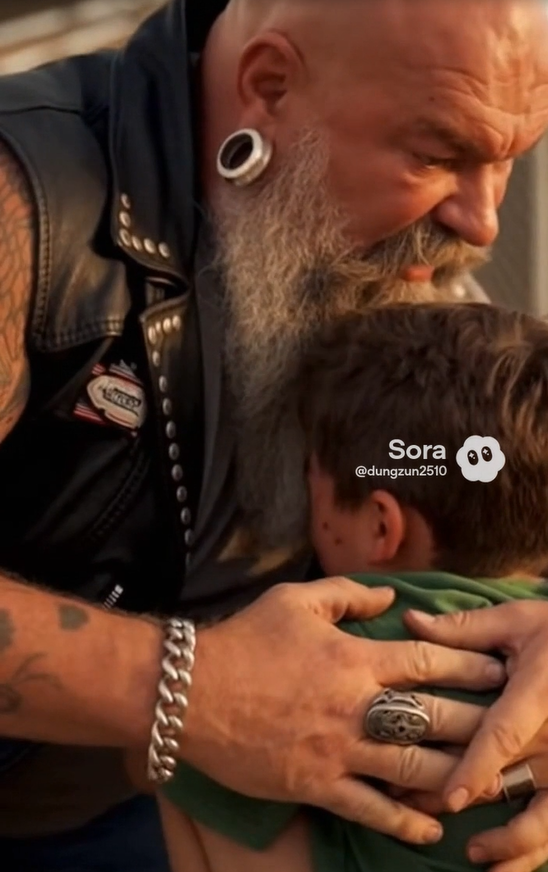 The biker turned and knelt beside Lucas. Up close, the boy could see that the coldness in his eyes had softened. Now, they looked warm, protective—almost tender.