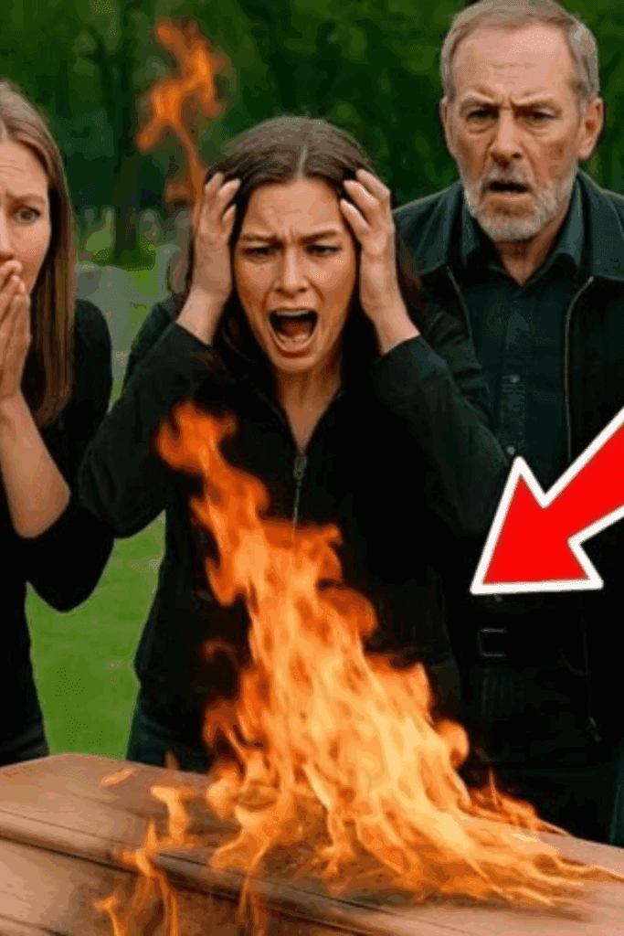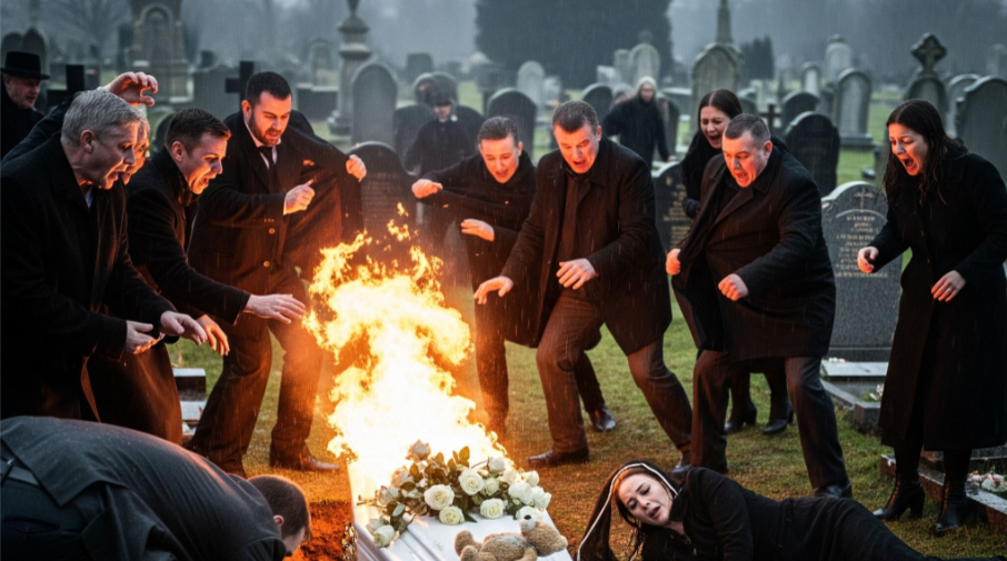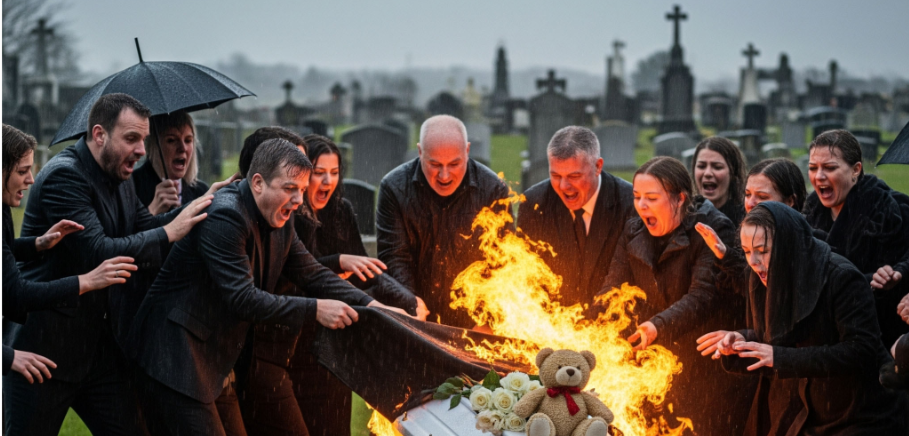 Then, the unimaginable happened. A sharp cracking sound broke the silence, and in an instant, flames erupted from the coffin. Panic filled the air. Someone shouted “Fire!” while the mother collapsed in shock. Relatives rushed forward, using jackets in desperation to smother the blaze.