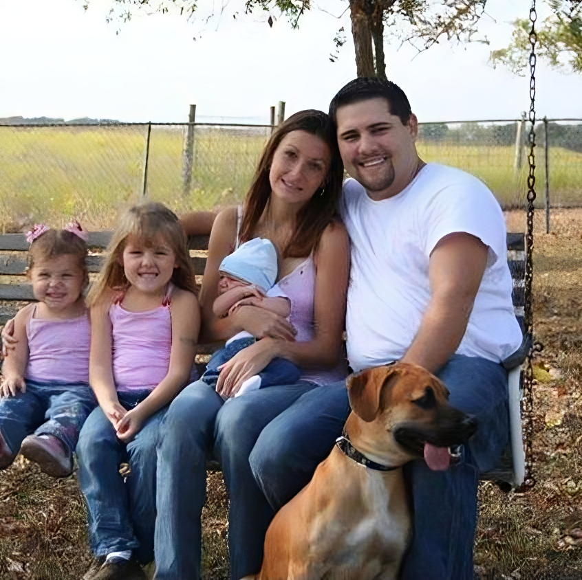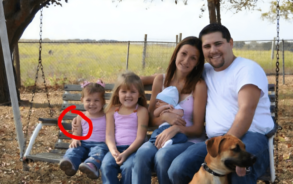 At first glance, the photo appears to be a typical family snapshot: a smiling mom, dad, and their two children. But a closer inspection reveals something unsettling. On the left side of the image, resting on the arm of the younger child, is a hand that seemingly belongs to no one