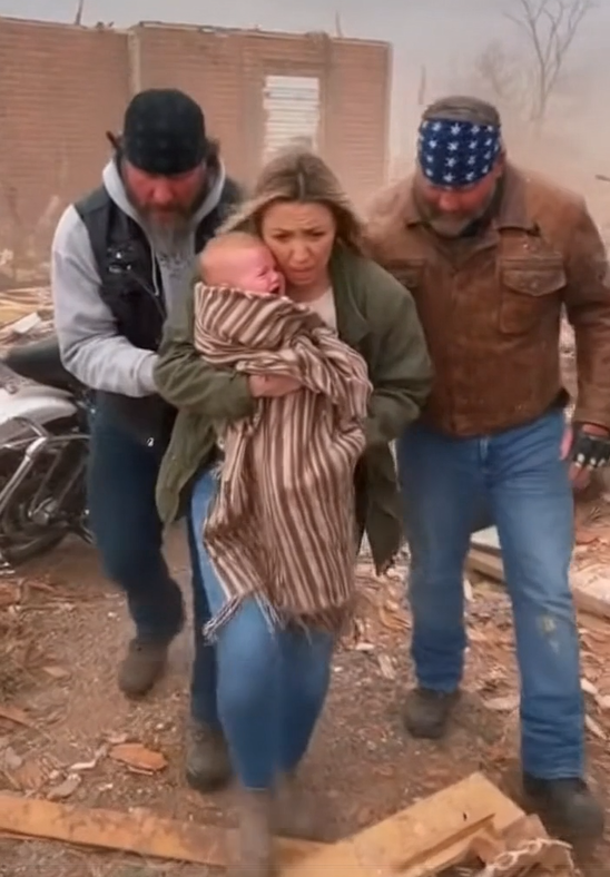 In the days that followed, news spread of the “bikers who saved a baby after the tornado.” Photos surfaced of the men standing beside the wreckage, their jackets covered in dirt, their faces solemn but proud. But when reporters tried to get their names or interviews, Bear simply said, “We’re not heroes. We’re brothers. And brothers take care of people — on or off the road.”