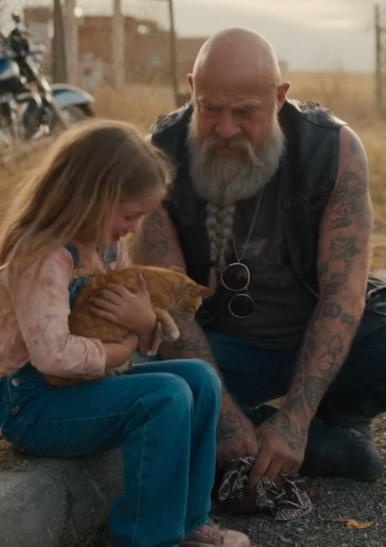 With one arm, Bear wrapped her gently to his side. They sat together in silence, a tough-looking biker in a leather vest and a heartbroken child holding the tiny body of the cat she loved. No loud words. No promises he couldn’t keep. Just presence—steady, warm, and human.