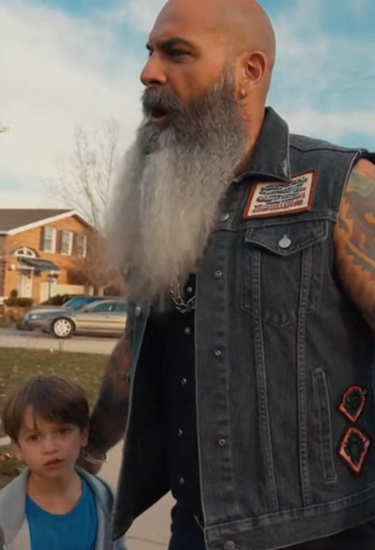 The stranger’s eyes widened at the sight of the biker—broad shoulders, shaved head, worn leather jacket, tattoos inked deep into his skin. He didn’t need to explain himself. His presence did the talking.