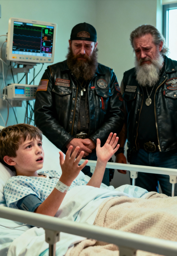 Inside lay Aiden Murphy. He was wrapped in tubes, his face swollen beyond recognition. But when his one good eye opened and saw us—five bikers in leather and steel—he didn’t flinch. “Are you angels?” he asked. “Am I dead?”