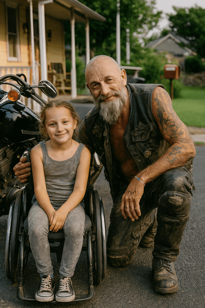 I parked outside his garage for twenty minutes before finding the courage to go in. Inside, the air smelled like oil and metal. Music blared. Every head turned when I wheeled in Lily’s broken chair. I almost turned around — until Mike looked up from the Harley he was fixing.