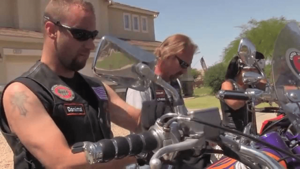 The rider lifted his hands calmly and removed his helmet. He was the picture of classic American biker culture — shaved head, thick beard, worn leather jacket, gloves that had clearly seen years of open-road miles. Despite his rugged appearance, his voice was steady and gentle.