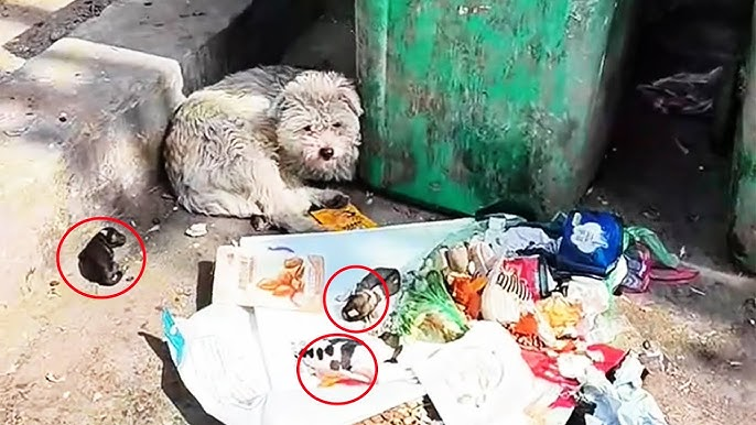 A skinny mother dog lay beside a torn cardboard box, her ribs sharp against her skin. Four tiny puppies clung to her belly, whimpering softly. Their fur was dirty, their cries weak, and the mother’s eyes—wide, scared, and tired—met his like a silent plea for mercy.