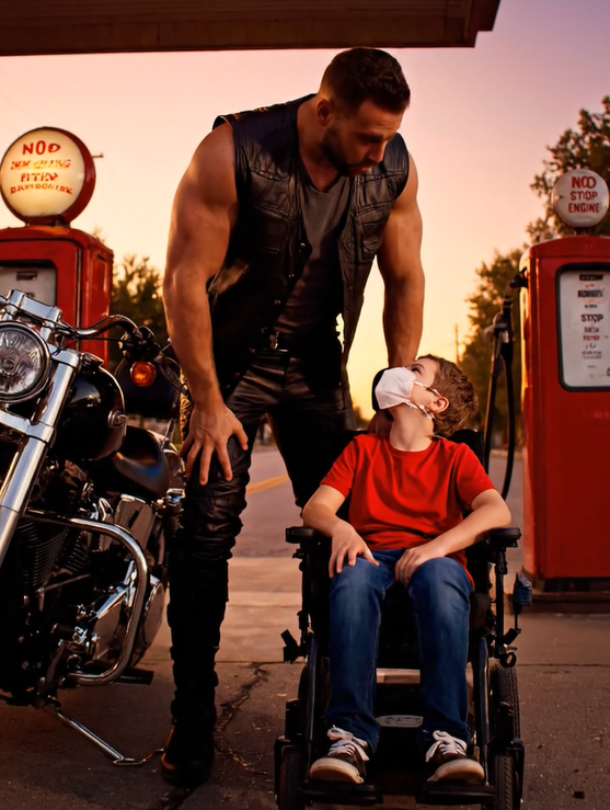 I was topping off my Harley outside Riverside when I noticed him — a small boy, maybe ten, in a worn-out wheelchair. His hospital bracelet still clung to his wrist, oxygen tubes ran from his nose, and his thin arms shook as he tried to push himself from one motorcycle to the next. Each biker brushed past him, too busy to stop. Three had already ridden off before I understood what was happening.