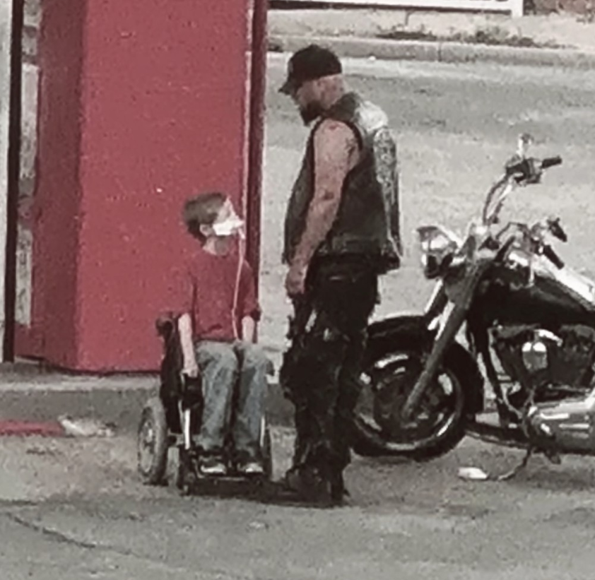 I was topping off my Harley outside Riverside when I noticed him — a small boy, maybe ten, in a worn-out wheelchair. His hospital bracelet still clung to his wrist, oxygen tubes ran from his nose, and his thin arms shook as he tried to push himself from one motorcycle to the next. Each biker brushed past him, too busy to stop. Three had already ridden off before I understood what was happening.