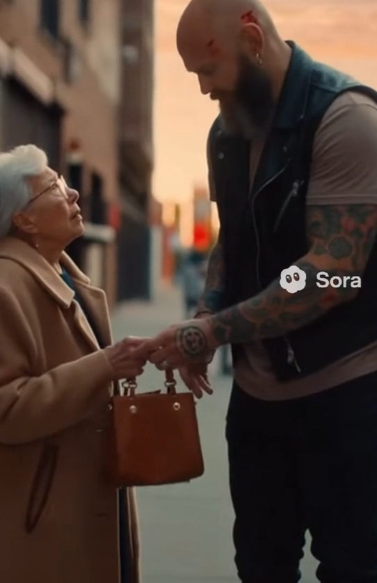 The elderly woman shuffled forward, tears in her eyes, clutching her bruised wrist. She looked up at the biker — this stranger who had thrown himself into danger for her — and whispered, “You didn’t have to do that, son.”