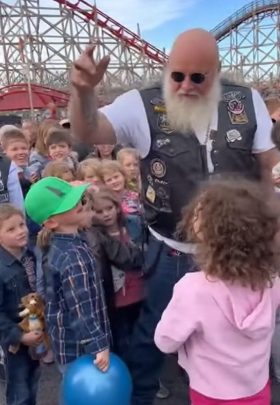 The bikers didn’t just watch — they joined in. There were tug-of-war games, races, and laughter loud enough to shake the clouds away. The toughest rider of them all ended up dunked in a tank by a group of giggling kids, while others handed out toys, cotton candy, and souvenirs.