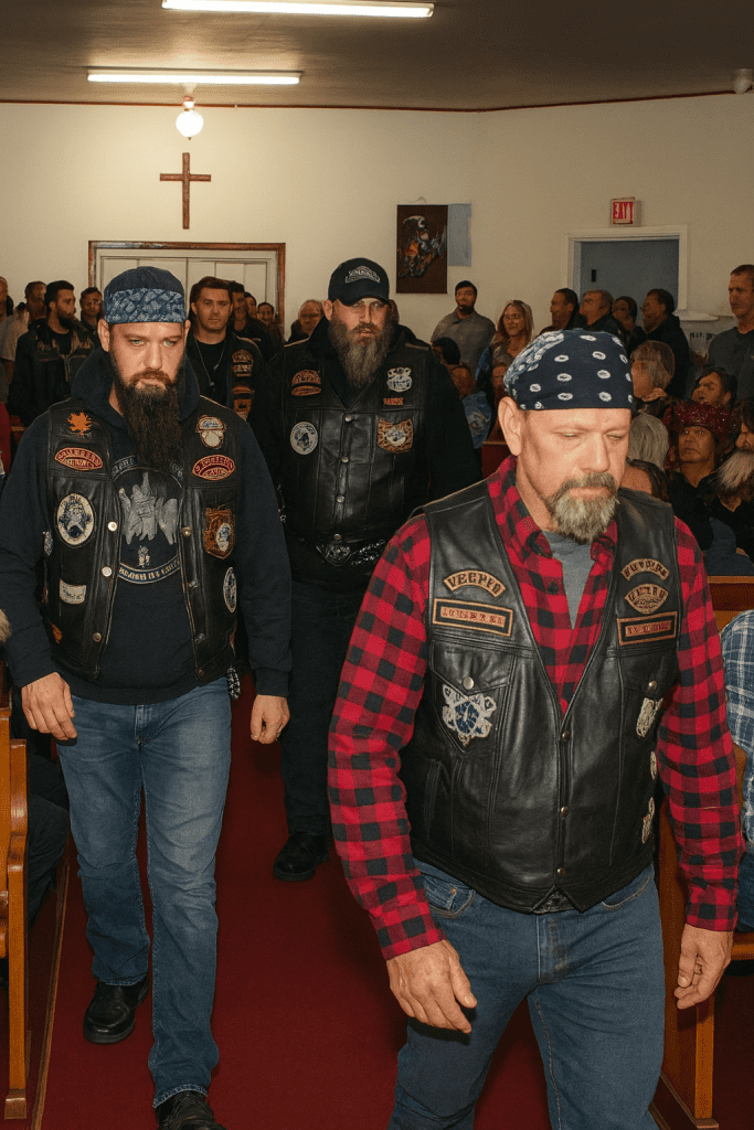 Every parent pulled their children close. Mothers covered tiny eyes, fathers stepped forward defensively, and the pastor froze mid-sermon, his Bible still open to a verse about love and mercy. For a heartbeat, everyone believed their worst fears had come true — that the outlaw bikers who rumbled through town on weekends had finally brought chaos into their sanctuary.
