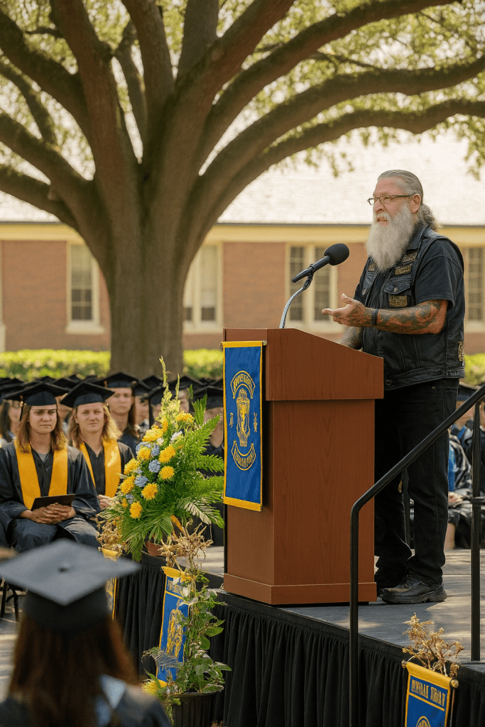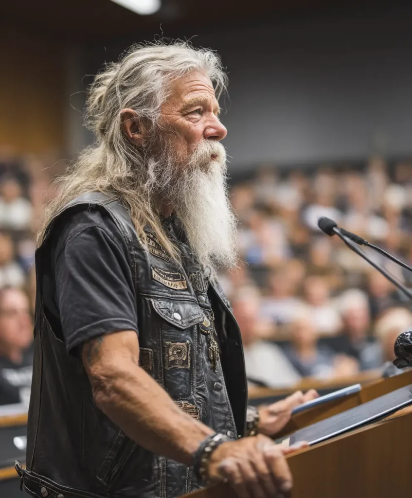 “Most of you don’t know me,” he said, his voice deep and steady. “Name’s Frank Morrison. I fix bikes for a living. Got grease under my nails that won’t come out and enough speeding tickets to wallpaper a garage.”