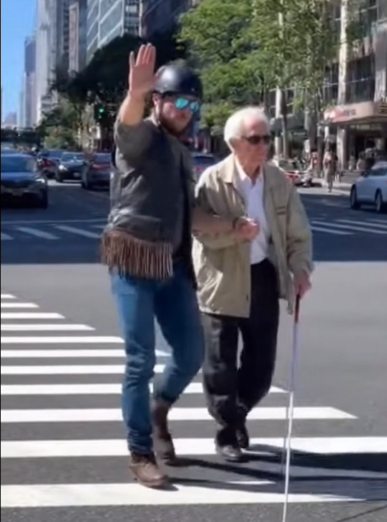 “Here, sir,” the biker said softly, offering his arm. “Let’s get you across.”