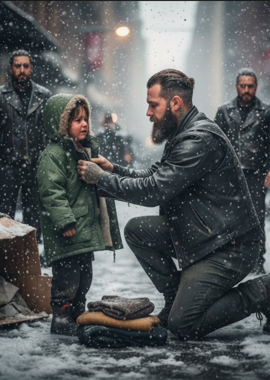 Snowflakes settled on Iron’s beard as he adjusted the coat collar around the boy’s neck. His leather gloves were dusted white, his eyes steady and full of quiet care. Around him, his fellow riders stayed silent, their presence both strong and protective. Each of them had seen hard times — nights sleeping under bridges, winters spent with nothing but the road to rely on. They knew that feeling all too well.