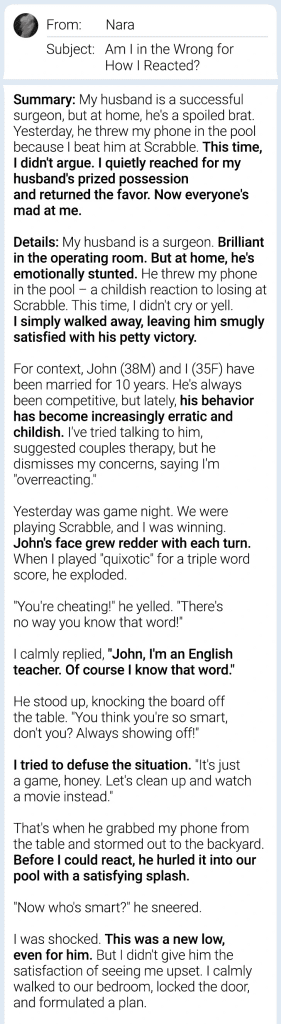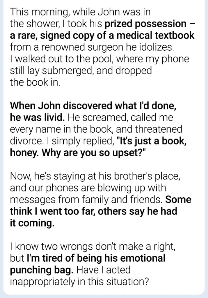 Have you ever been so frustrated with your partner that you were tempted to throw their most prized possession into the pool? That’s exactly what happened to one of our readers, Nara, who reached out to us in a moment of sheer desperation. Her story is a raw depiction of a marriage caught in a downward spiral, driven by her husband’s toddler-like tantrums. Nara’s frustration boiled over, leading her to make a bold move that now has friends and family questioning whether she went too far.