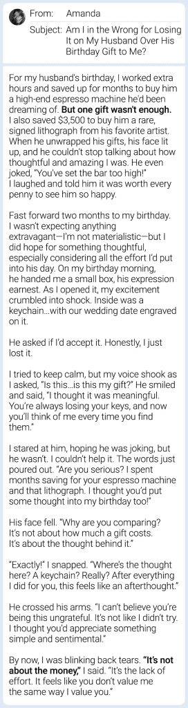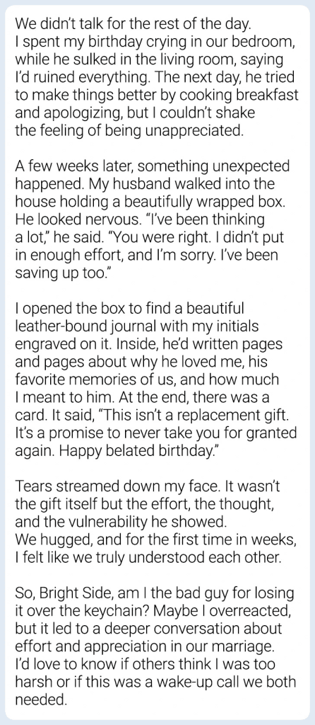 “I don’t care about how much a gift costs, but I put so much effort into making your birthday special. I saved for months, planned everything, and made sure you felt appreciated. And you gave me… a keychain?”