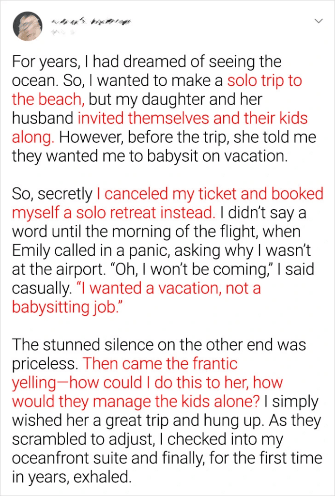 One reader recently shared her story—what was meant to be a relaxing vacation turned into a nonstop childcare marathon. Her daughter invited herself and her family on the trip, but instead of spending quality time together, it quickly became clear that grandma was expected to be the full-time babysitter.