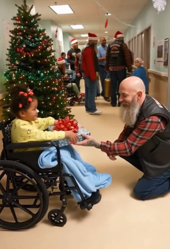 The bikers don’t just drop off gifts — they stay. One strums a guitar and sings Silent Night in a gravelly voice that makes everyone laugh. Another tries juggling candy canes. The children, once shy, now beam with delight. The nurses join in. Even parents — weary from endless hospital days — find themselves smiling again.