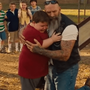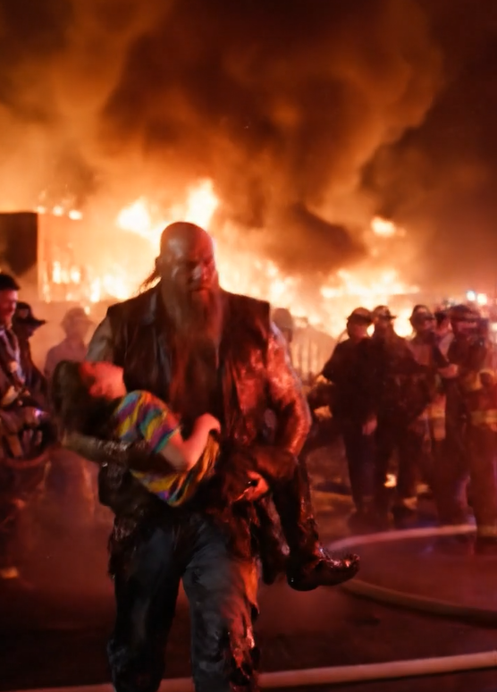 Tank’s instincts took over. He wrapped his leather jacket around the boy to shield him, then gripped the burning beam. Pain tore through his hands as fire bit into his flesh, but he didn’t let go. With every ounce of strength left in him, he lifted — once, twice — until finally, the beam gave way.