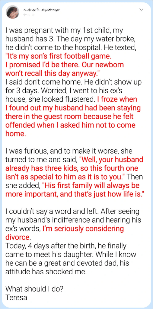 The birth of a child is a profound event, meant to be a shared moment of joy for parents. For Teresa, however, this life-changing experience became a source of pain when her husband chose to attend his son’s event rather than be there for the birth of their baby. This decision didn’t just hurt Teresa—it set off a series of challenging events that left her questioning her marriage and seeking guidance. Below, we explore Teresa’s situation, offer practical advice, and provide steps to help her navigate this difficult chapter in her life.