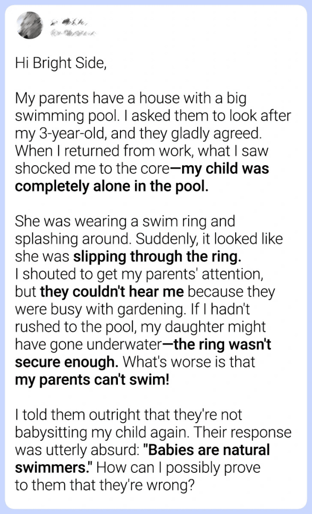 I had entrusted my parents to watch my daughter while I was at work, but they had clearly failed to provide the constant supervision a toddler requires around a pool. This was a serious breach of trust, and I knew I had to address it head-on. It was a difficult conversation, but I had to make it clear that their negligence put my child’s life at risk, and I couldn’t simply overlook it.